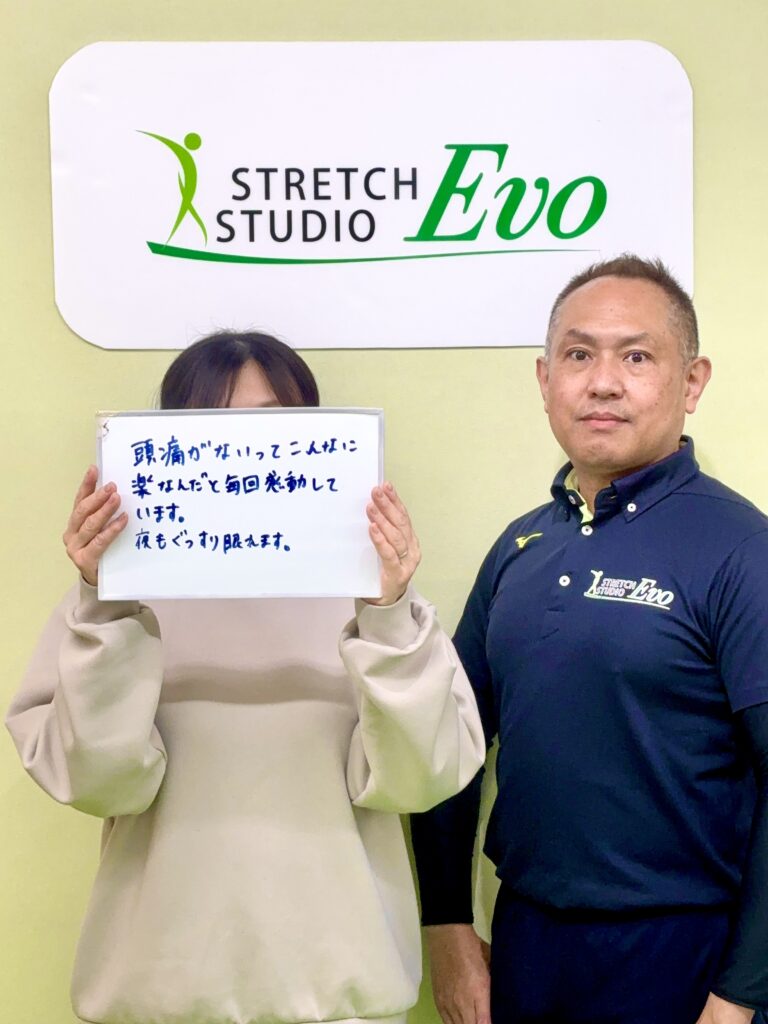 施術では、深層筋へのストレッチと呼吸法を組み合わせ、骨盤を立てて、首の位置を整えていきました。「全然違う」「すごい変わる」と、その場で変化を実感されたK様。足のむくみも取れて、「下半身も軽くなった」と笑顔を見せてくださいました。