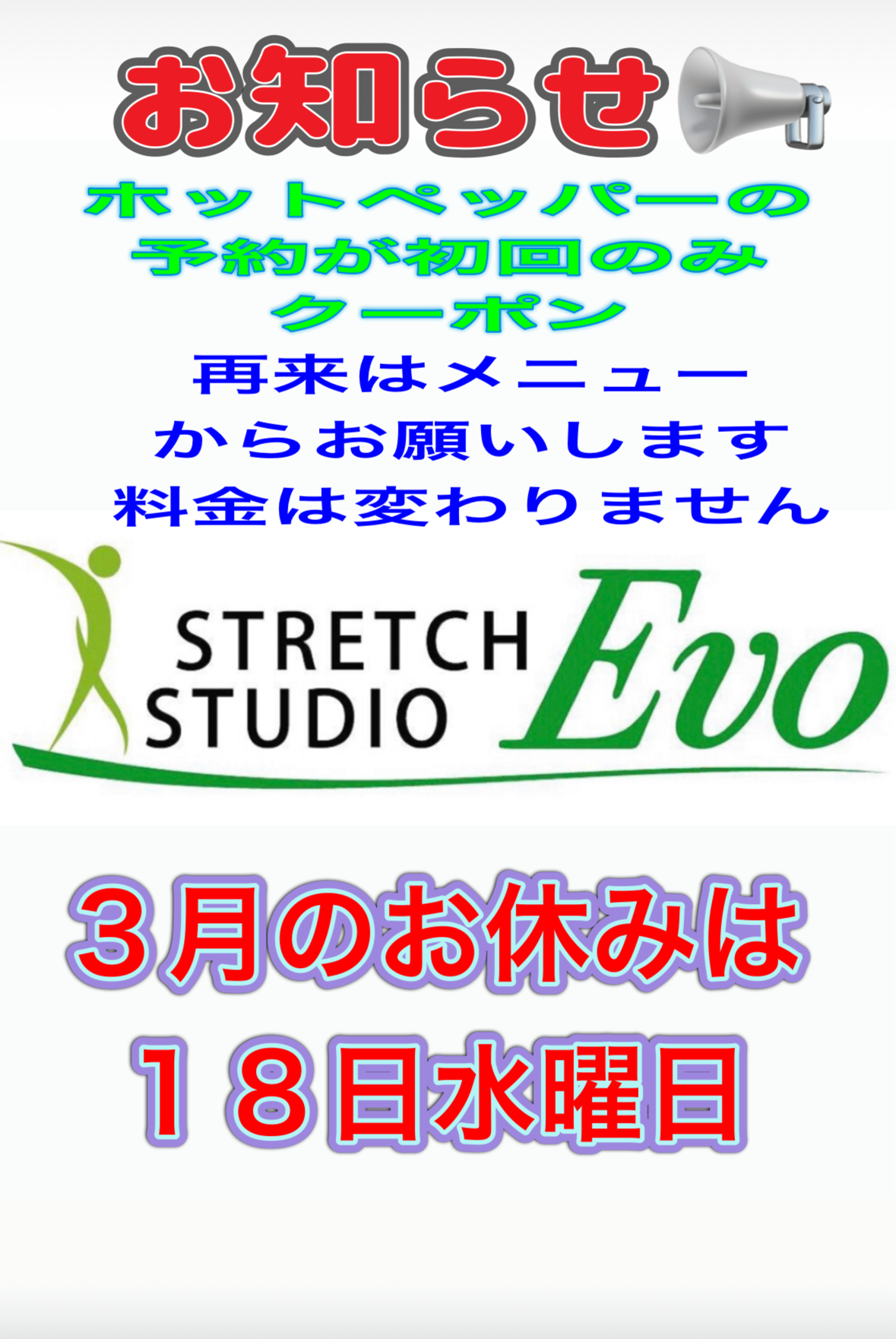 3月のお休みは18日水曜日です。